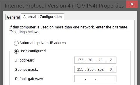- Click the Alternate Configuration tab and click the User Configured radio button.