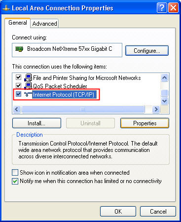 - In the window that appears, select the Internet Protocol (TCP/IP) entry and click