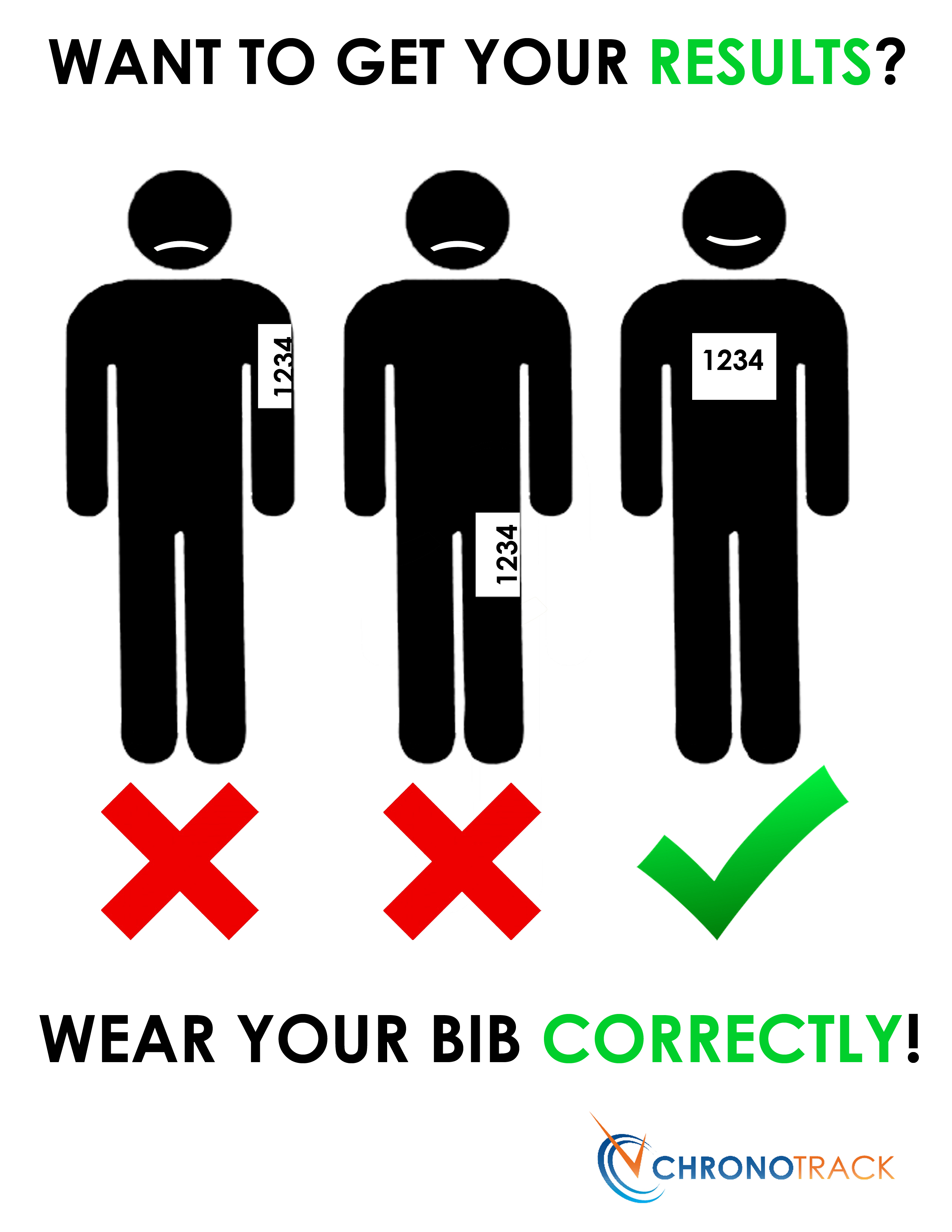 This image can be printed in poster size and posted around your Packet Pickup area and Start Line to encourage athletes to wear their bib correctly, thus better guaranteeing that they get read and get their results.