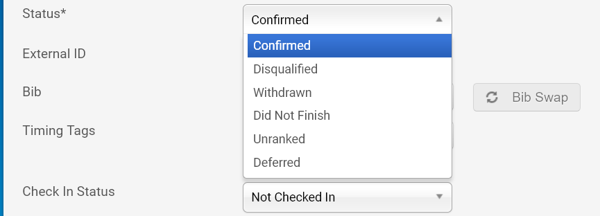 - Deferred - This status is automatically applied to any athletes who complete the Race Change/Deferral process in an event, but you can also manually set the athlete to Deferred if you made external arrangements to defer their registration to another event or race.
