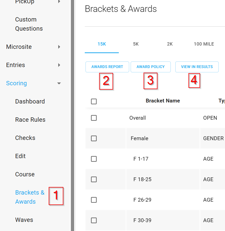 The Awards Report in CT Live for each of your races can be accessed from the same Awards page where Brackets/Awards are configured.