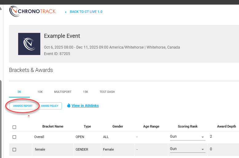 The Awards Report in CT Live for each of your races can be accessed from the same Awards page where Brackets/Awards are configured.
