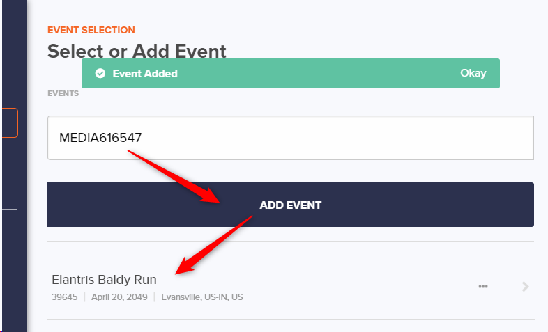 Now, paste the code into the text field in the Event Selection panel of Media Uploader and click Add Event. You'll see a success message and the event will appear below the Add Event button.
