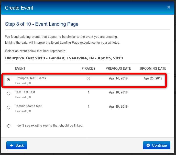 On the Event Landing Page step of event creation, your Test Master event should be the top suggestion for linking to Athlinks.