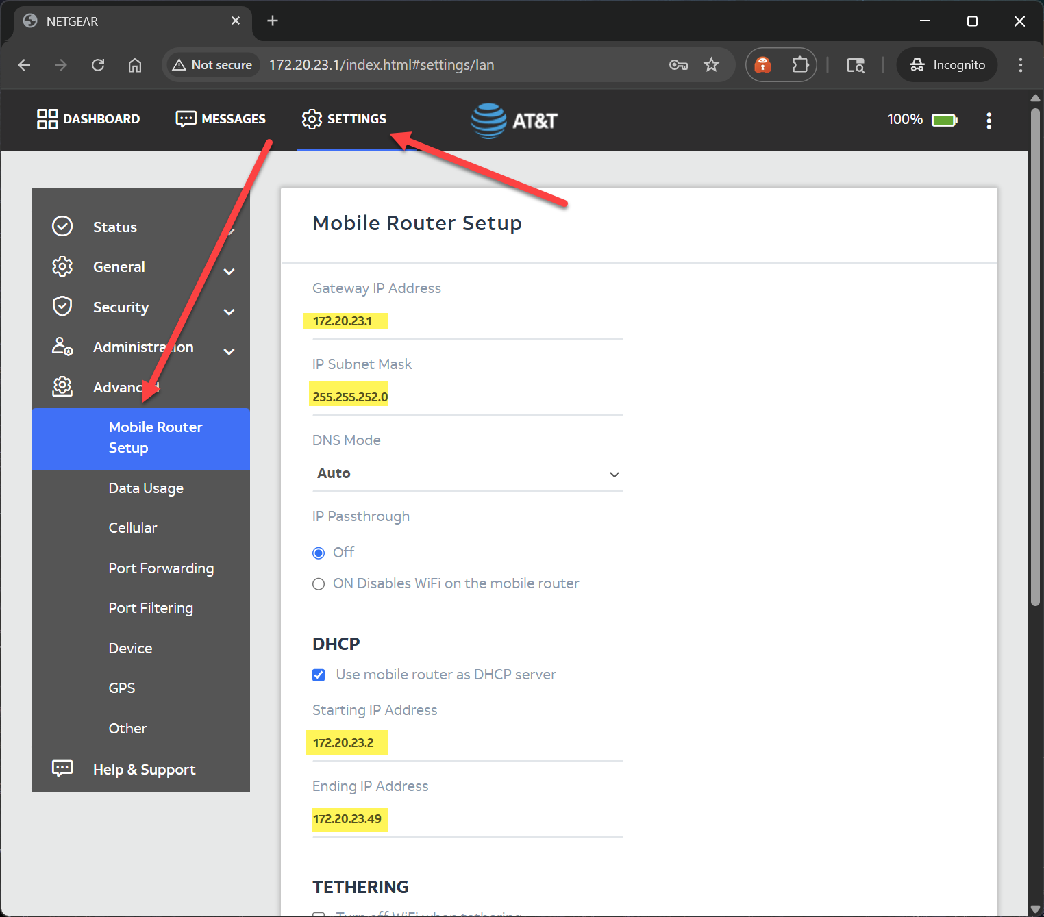 You will need to reconnect to the Nighthawk if you choose a new WiFi SSID and/or Password. We highly recommend changing these from the default to prevent unauthorized devices from connecting to your router. - After completing the initial setup prompts, click the Settings option and go to the Mobile Router Setup tab under Advanced and edit the information on that page to exactly match the images below.