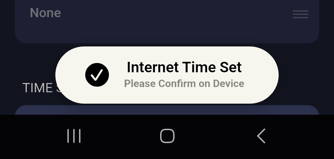 Stand by for a short time while the time sync goes through, and then it will display "Time set" and the time will be displayed. Press either button to confirm and return to the main screen.