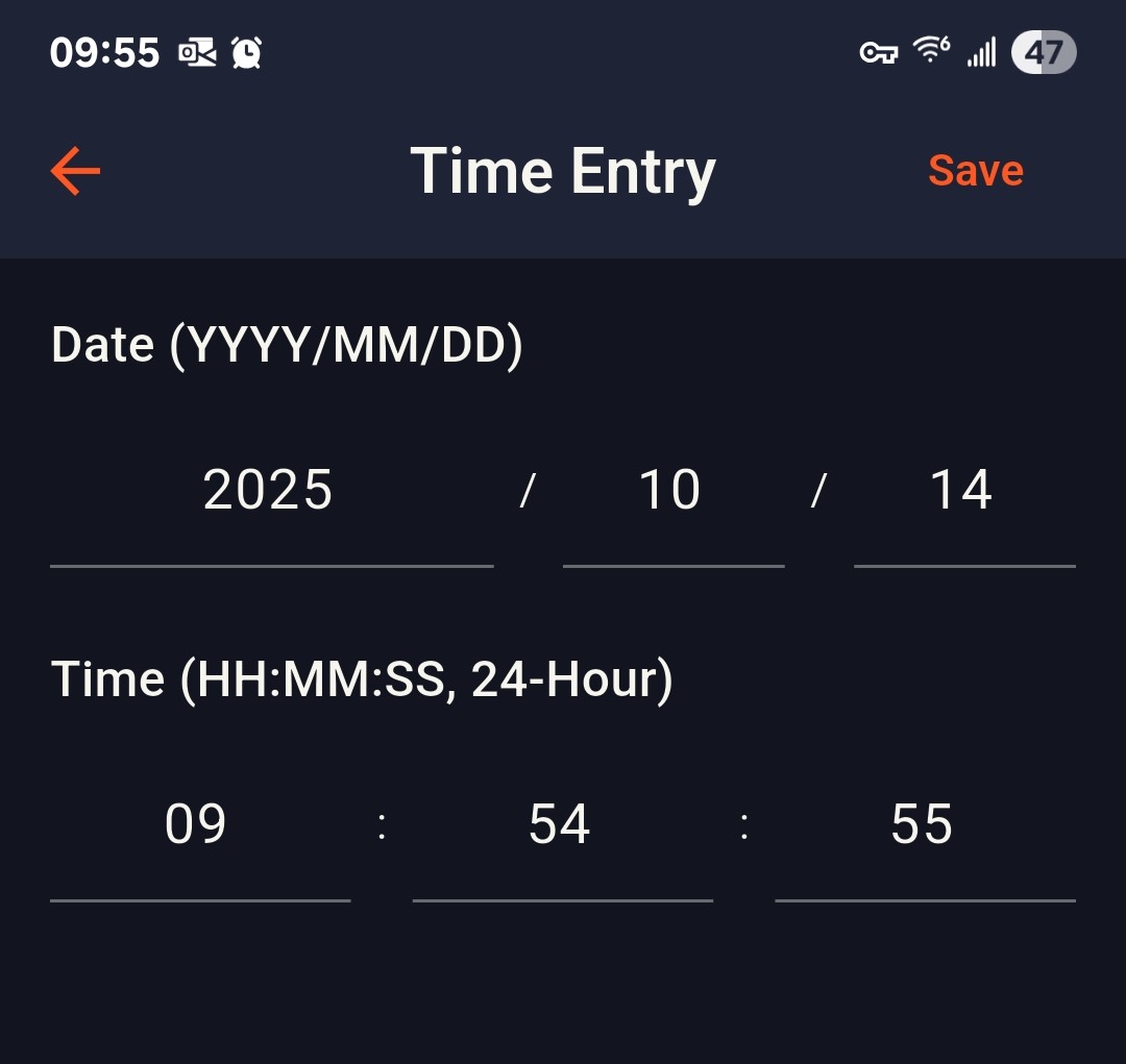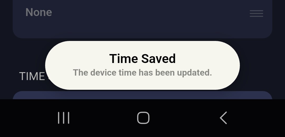 Set the time and date (12/24 hour time settings will be reflected from your Time Format choice in the app) and choose Save. You will see a success notification.