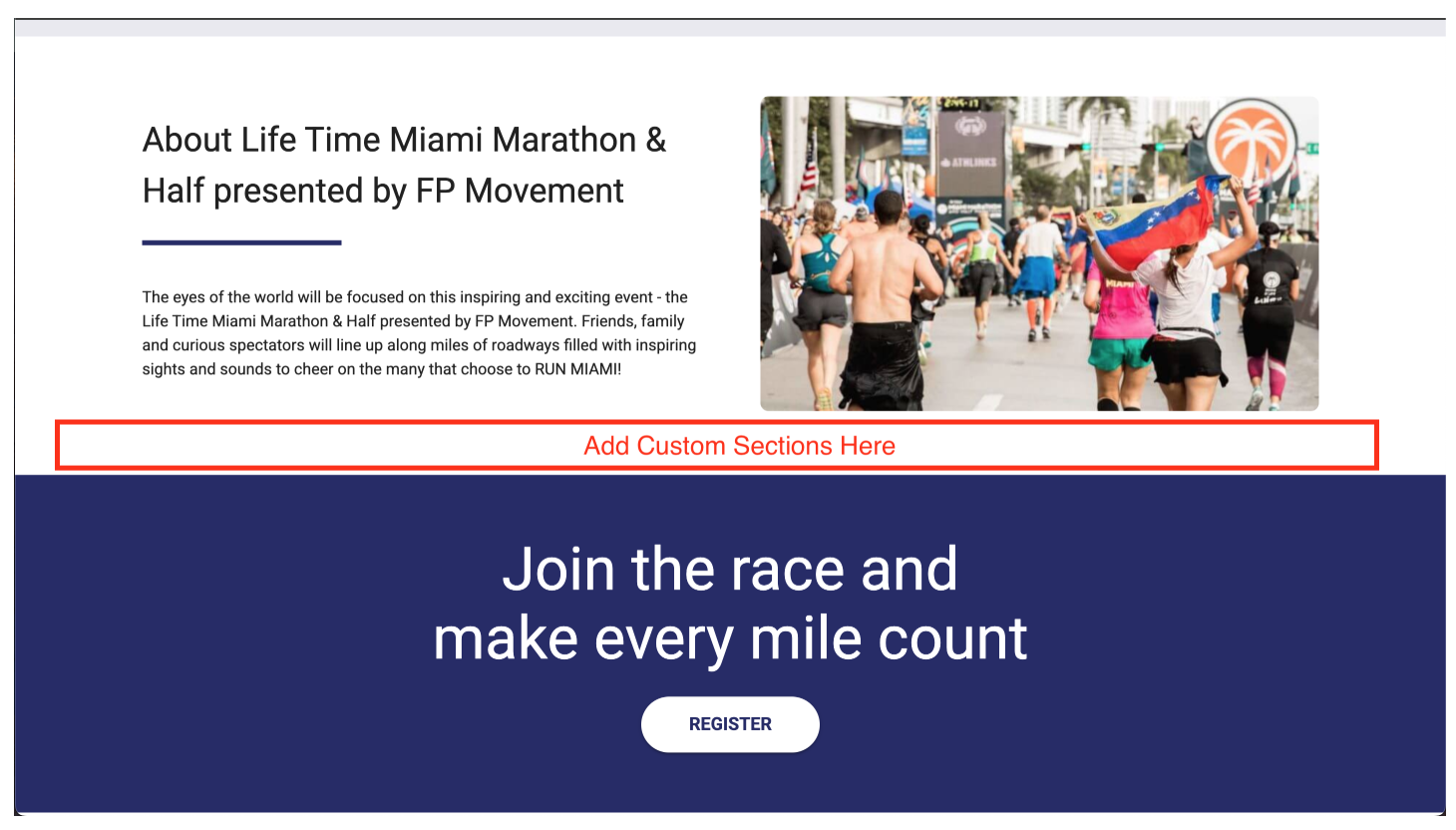 In ChronoTrack Live 2.0, you can add custom content sections to your event's microsite. When published, these sections appear directly below the About section in the microsite, and are ideal for highlighting event details, schedules, sponsor promotions, or personalized messages.