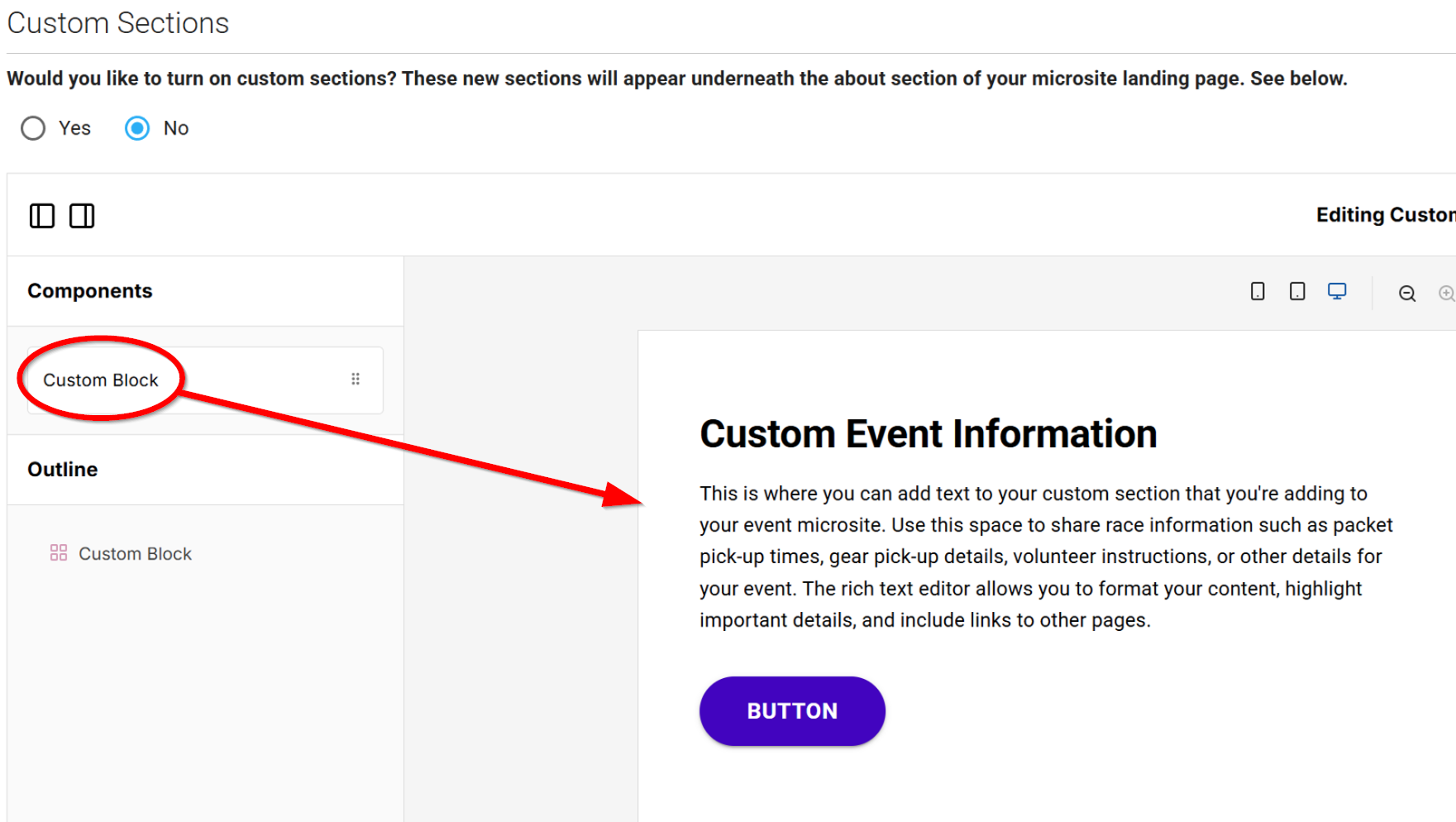 At the top, there is an option to turn on custom sections, making them visible on the microsite. Because of this, we recommend waiting to toggle visibility to "Yes" until you have finished setting up the custom sections to your liking.