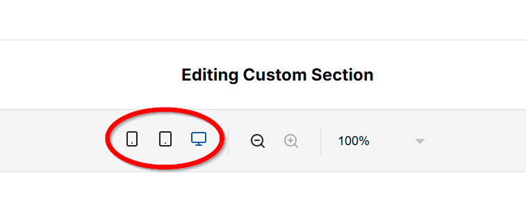 Format your view using the buttons located at the top-center of the editor: The view buttons on the left will display how your custom section will look on mobile, tablet, and laptop/desktop devices.