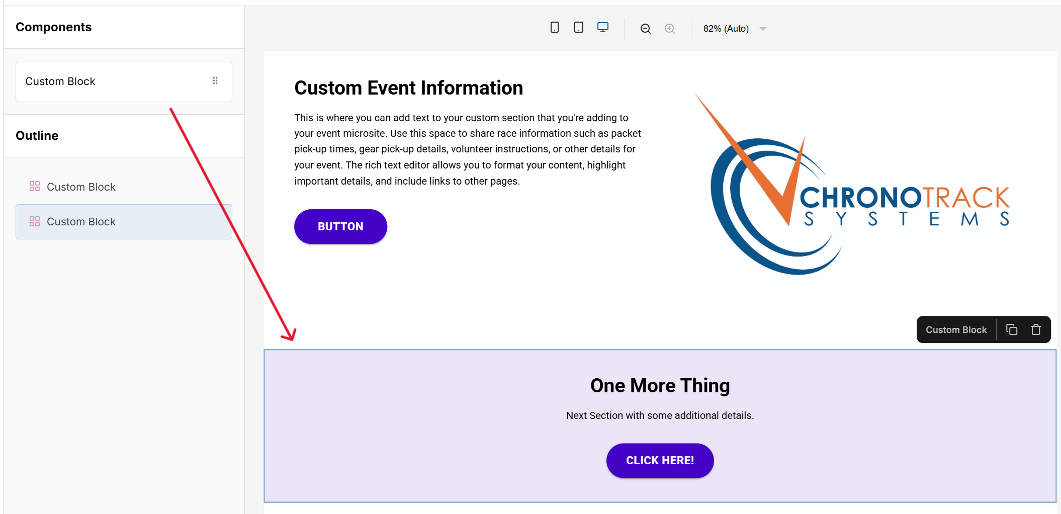 Add your first custom section by clicking and dragging a Custom Block from the Components section to the middle area of the editor:
