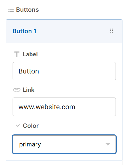 Finally, you can set the buttons of your custom block. First, select the Block that contains the button you want to edit, then click Button 1 (or another, if there are more than one) to expand that section and display three customization options: