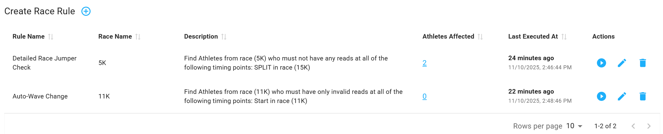 - Actions are buttons that allow you to run, edit, or delete a Race Rule.