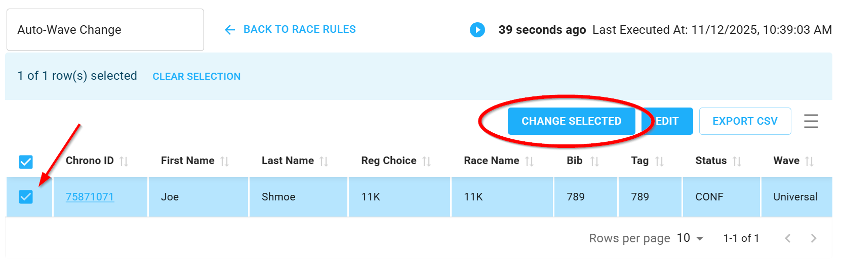 Running the Race Rule again, we will see that the athlete is no longer identified, as he has been moved to the second wave.
