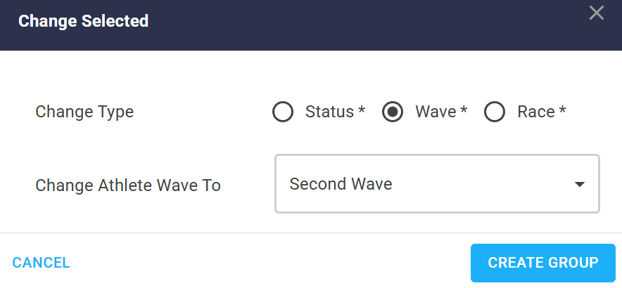 There are three options for you to change in Race Rules: Status, Wave, and Race. In this case, we are moving the identified athletes to a new wave.