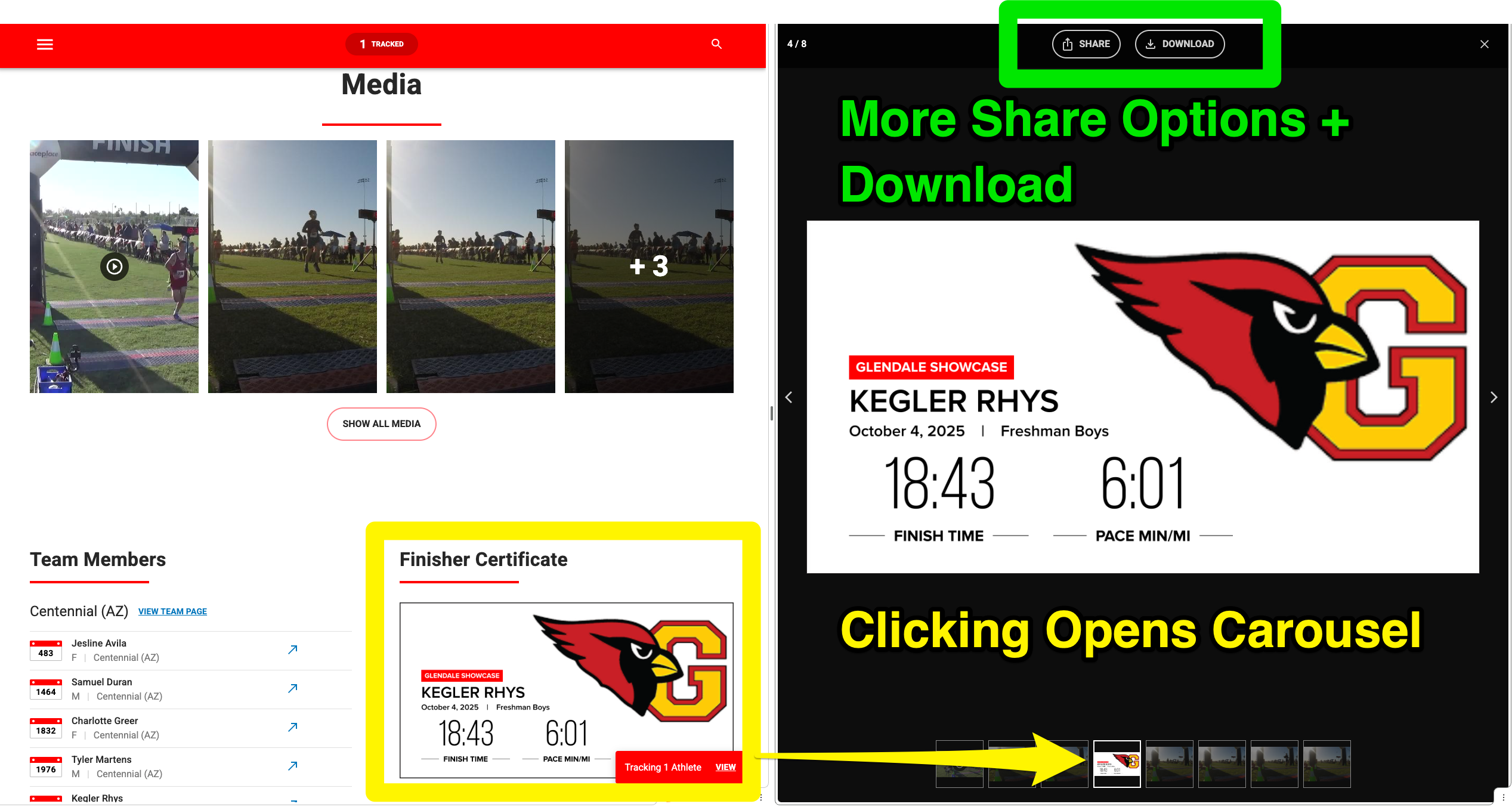 Not only are our updated Finisher Certs more customizable than ever before, they also now have expanded Share options. Previously, they were only shareable via Facebook and sometimes weren't even able to easily be downloaded. Now, Finisher Certificates are clickable and will expand to be included within the Media Carousel.