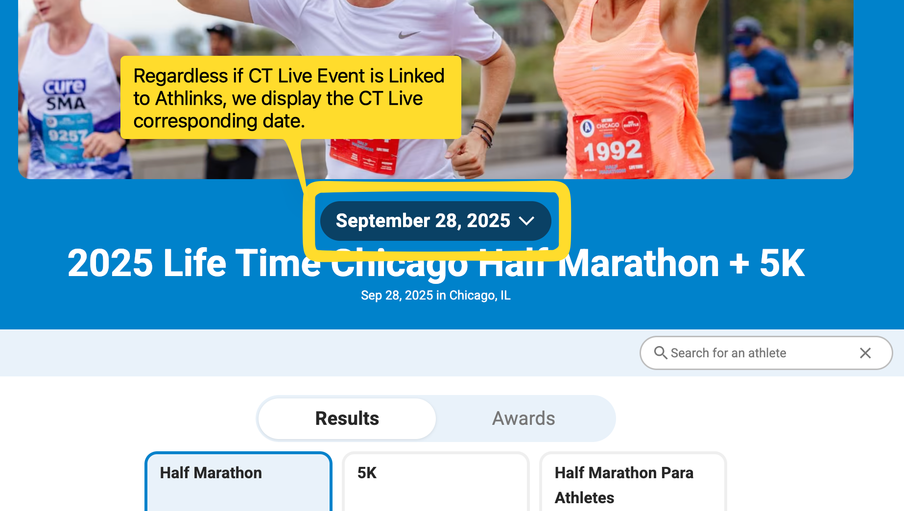 Historically, it was painful to keep Athlinks and CT Live Event related data in sync. We're happy to share that we now show the CT Live Event date at all times.