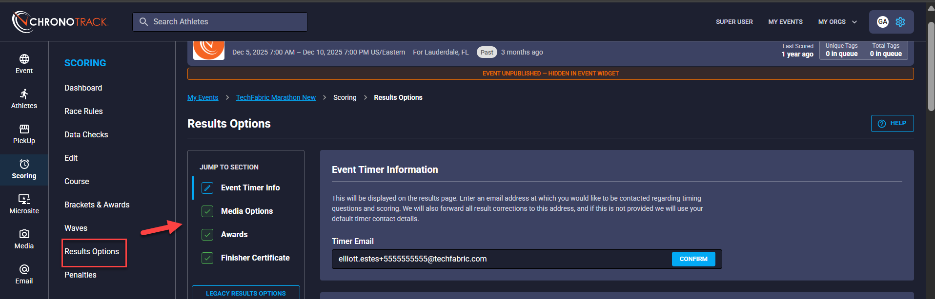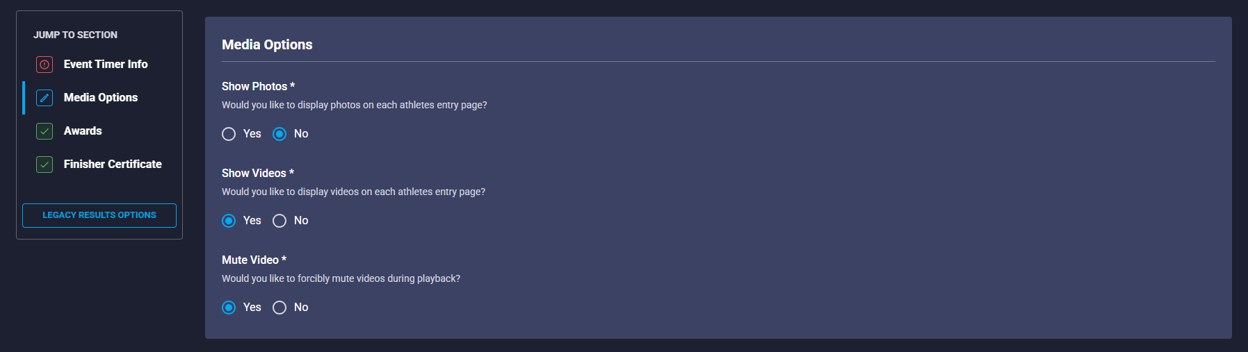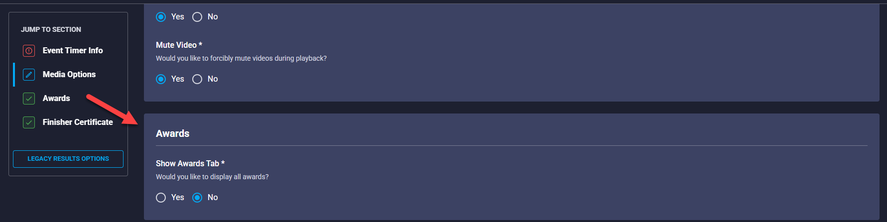 The Results Options tab contains options that influence how Results are displayed. The tab is broken up into four categories – Event Timer Info, Media Options, Awards, and Finisher Certificates. You can toggle between these by clicking on the corresponding option from the "jump to section" menu on the Results Options page.