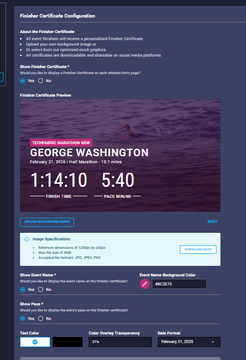 - Select an Optimized Image - Allows you to choose an image for the Finishers Certificate from a curated list.
