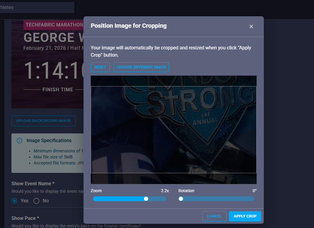 Upload Background Image - Allows you to upload an image to be used for a Finishers Certificate background. Once the button is hit it will open up a sizing menu.