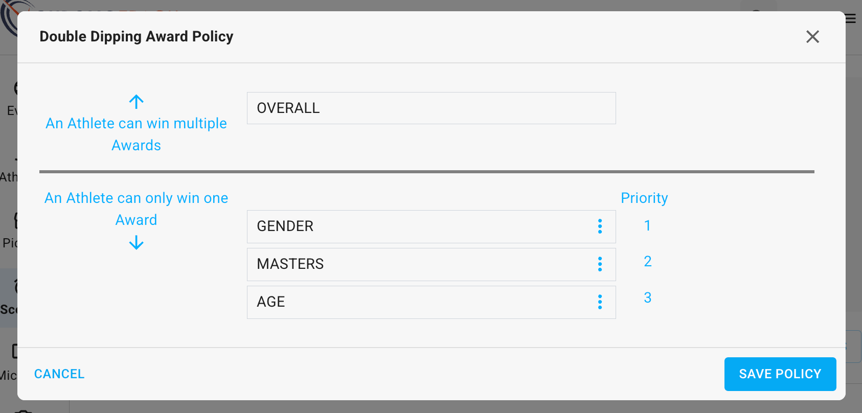 New Races that are created within New Events have a new default Award Policy. This new default aligns with the common practice of preventing Athletes from winning multiple Awards.